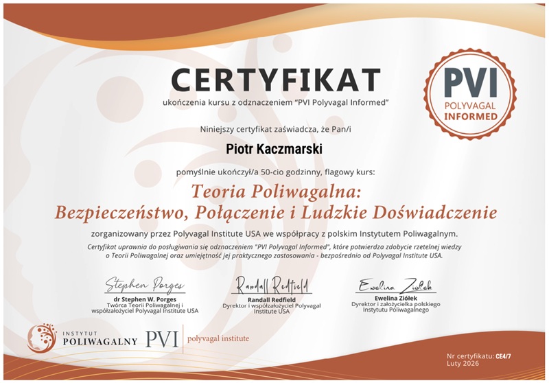 Jestem dyplomowanym coachem (SWPS), certyfikowanym trenerem odporności psychicznej TOP360, certyfikowanym trenerem LifePlan Academy, trenerem FRIS® raz certyfikowanym praktykiem PVI z wieloletnim doświadczeniem w pracy z osobami, które pragną wprowadzić pozytywne zmiany w swoim życiu. Swoją wiedzę stale pogłębiam – obecnie jestem na czwartym roku psychologii ze specjalizacją w neuropsychologii.